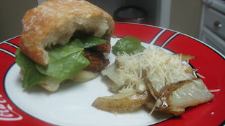 The oven fries are simply sliced and roasted potatoes until golden brown or until you are so hungry you can't stand it anymore....check out my picture and see if you can figure out which one I did. :) Then tossed with a mixture of olive oil, garlic, salt, and pepper. Then sprinkled with parmesean cheese.